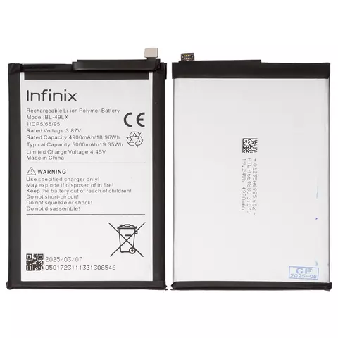 Batería BL-49LX puede usarse con Infinix Hot 12 (X6817), Hot 20 (X6826), Hot 20S (X6827), Li-Polymer, 3.87 V, 5000 mAh, Original (PRC)