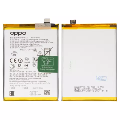 Batería BLPA21 puede usarse con Oppo A18, Li-Polymer, 3.87 V, 5000 mAh, Original (PRC)