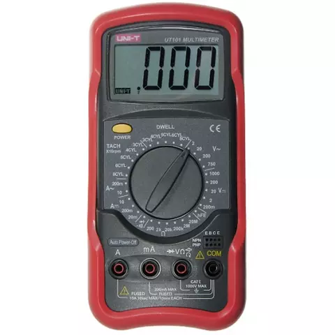 UNI-T UT101 es un multímetro digital automotriz diseñado para medir voltaje AC/DC, corriente AC/DC, resistencia, Dwell, Tach, realizar chequeo de diodos y transistores, continuidad de circuitos.