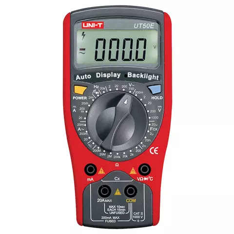 Multímetro digital UNI-T UT50E es un un aparato de tamaño de bolsillo, alimentado por una batería de 9 voltios. Diseñado para medir voltaje, corriente, resistencia, capacitancia, temperatura, frecuencia, realizar chequeo de diodos y probar continuidad de circuitos.