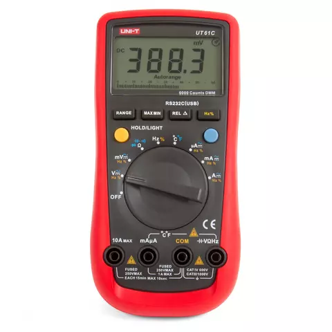 Multímetro digital UNI-T UT61C es un multímetro de alta precisión con tamaño de bolsillo – un aparato portátil y cómodo, alimentado por una batería de 9 voltios. Multímetro UNI-T UT61C permite medir varios parámetros (voltaje, corriente, resistencia, capacitancia, frecuencia, temperatura), realizar pruebas (chequeo de diodos, continuidad de circuitos), tiene funciones de apagado automático, retención de datos, visualización de datos en forma de barras analógicas.