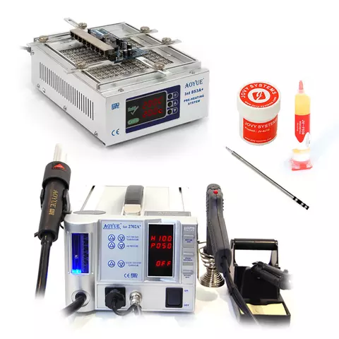 Estación de soldadura AOYUE, pre-calentador infrarrojo AOYUE, fundente y pasta de soldadura, incluidos en el paquete, permiten realizar diferentes tareas relacionadas con reparación de equipos electrónicos. Esta combinación de herramientas permite soldar y desoldar los circuitos SMD/BGA, con ayuda de pistola desoldadora desoldar los microchips en las carcasas DIP, reparar pequeñas y medianas placas, montar y desmontar diferentes componentes electrónicos.