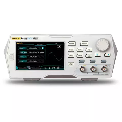 RIGOL DG832 es un generador de funciones arbitrarias de dos canales con el ancho de banda 35 MHz, frecuencia de muestreo 125 MSa/s y memoria de 2 MB.