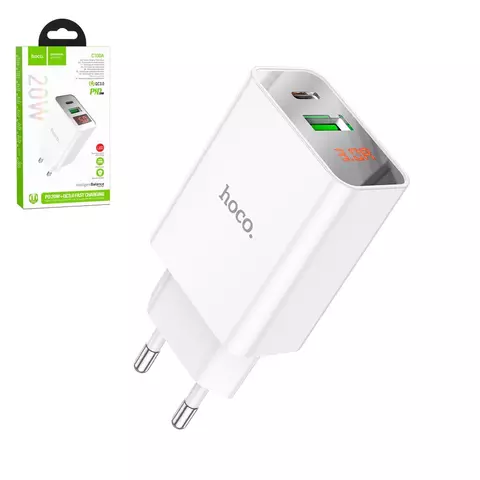 Adaptador de red Hoco C100A, 20 W, Quick Charge, Power Delivery (PD), blanco, con LCD, 2 puertos, #6931474769800
