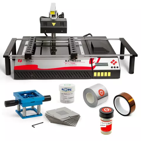 Juego de herramientas para reparar ordenadores portátiles y tabletas incluye una estación de soldadura infrarroja y herramientas auxiliares para reballing de componentes SMD / BGA. Está destinado para técnicos electrónicos, ingenieros y centros de servicio de ordenadores.