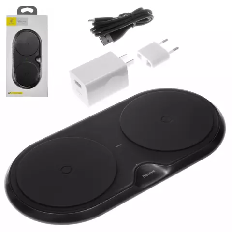 Cargador inalámbrico Baseus Dual Plastic Style, Quick Charge, para dos teléfonos, 220 V, (USB tipo-C entrada 5V 3A/9V 3A), (salidas 5V/7.5V/10V), negro, plástico, #WXSJK-01